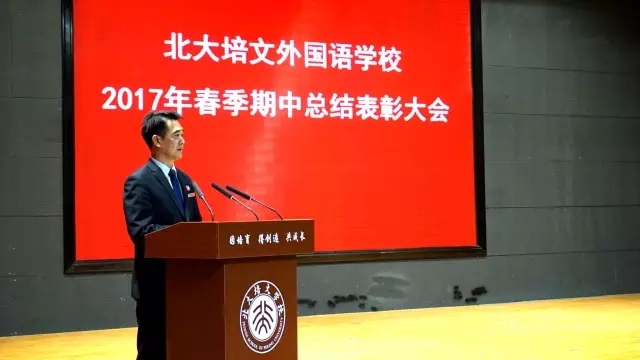 大会在雄壮的国歌声中拉开序幕。升旗仪式后,北大培文外国语学校教学副校长任喜峰对本次期中考试做了全面系统的总结,并对以后的工作给予了殷切的希望,寄语全体同学珍惜时间,勤奋学习。